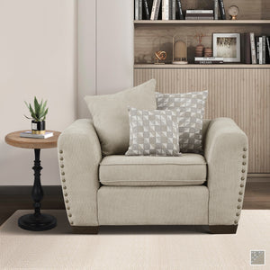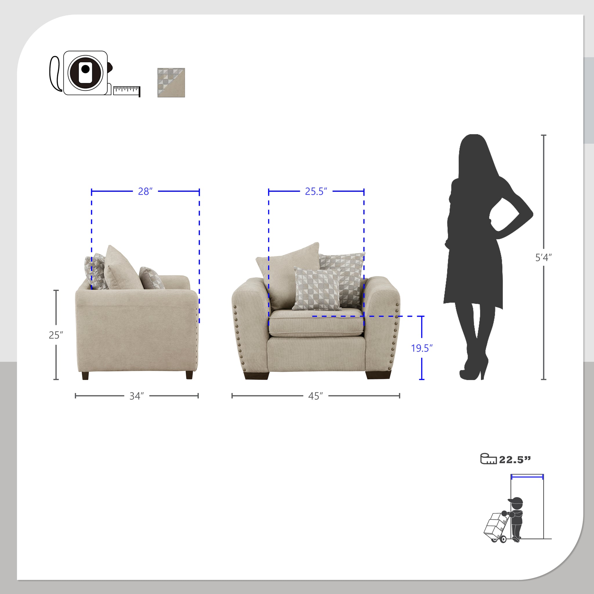 Designed for the transitional style that defines your home’s décor, the Ezra Collection pairs classic accents with a refined profile. The contoured arms of the chair feature oversized nailhead trim. Sesame-hued chenille fabric upholstery covers the seating, and loose back pillows, its neutral hue complemented by the accompanying geometric toss pillows. Solid wood feet support the collection.