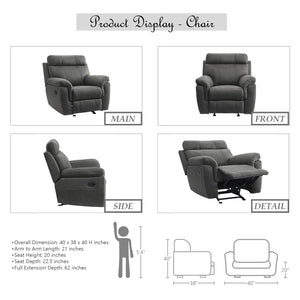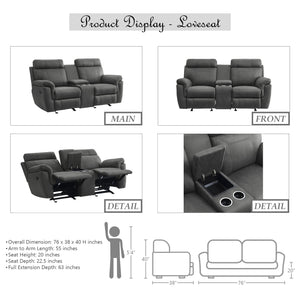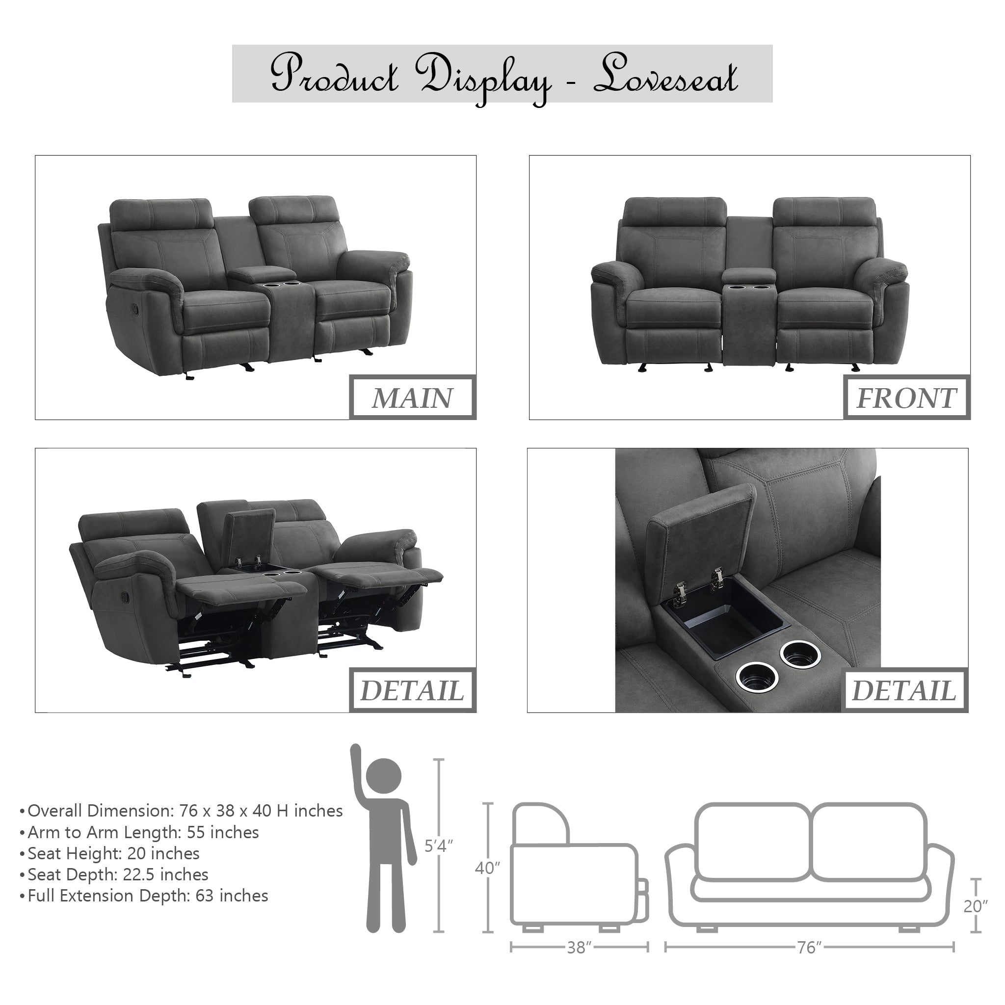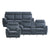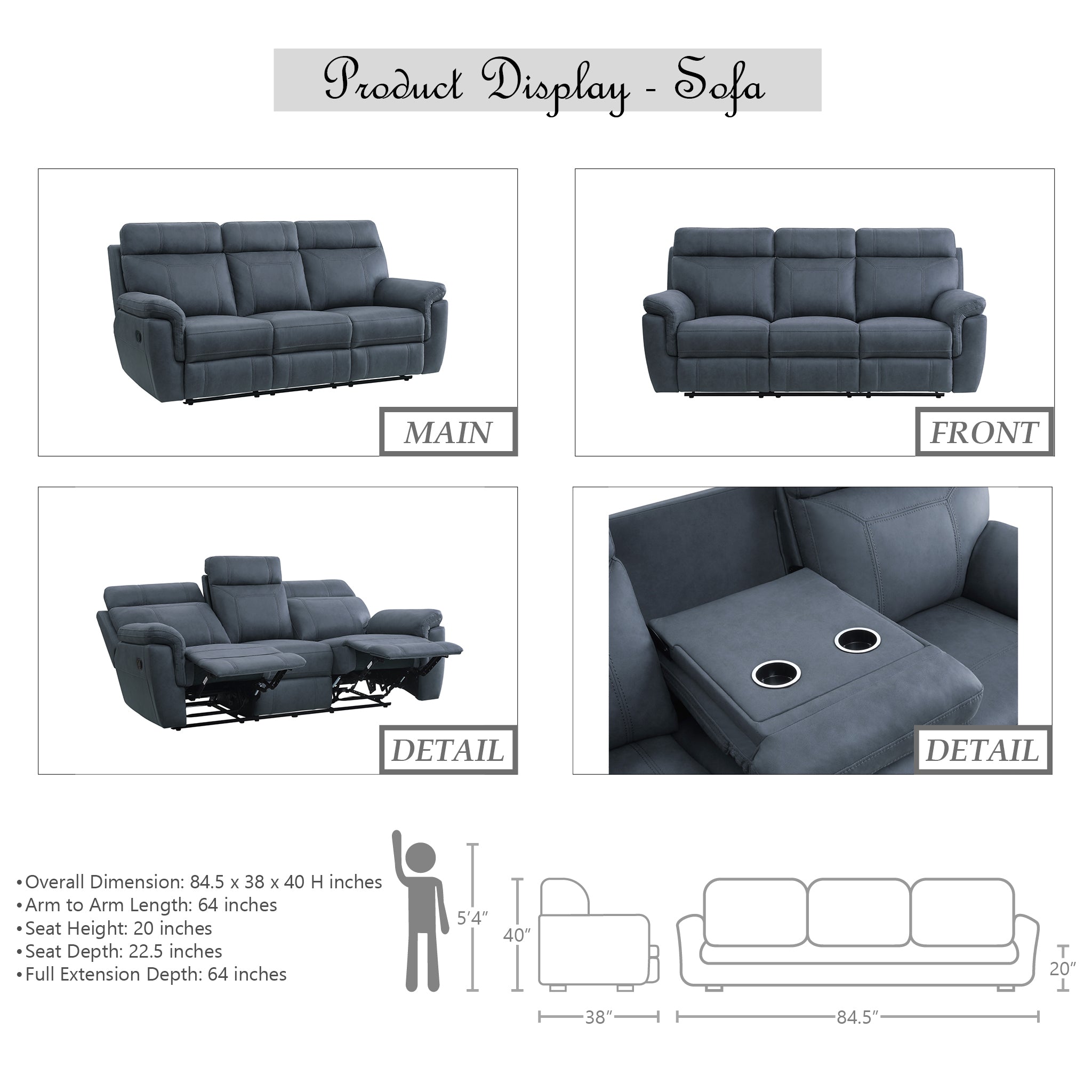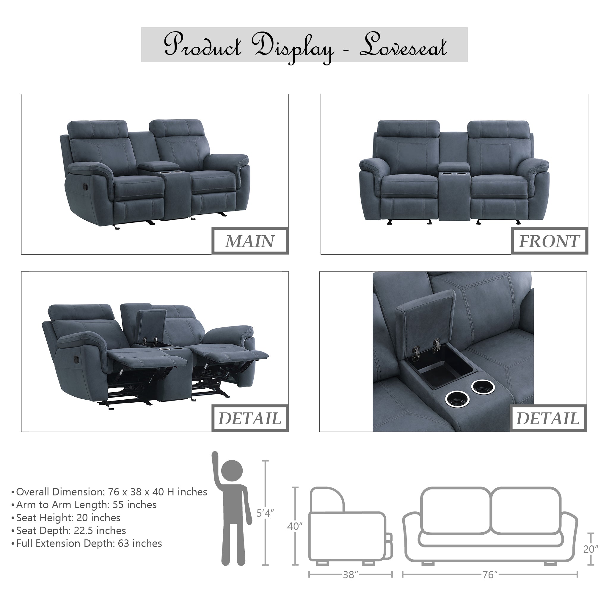 The modern profile of the Metz Collection serves to provide comfort, function and style to your home’s casual living room. The polished microfiber that covers the plush arms and seating of the sofa, love seat and chair lends to the decorative versatility of the collection. The sofa features dual reclining ends and a drop down center seat back with cup-holders and tabletop, the dual glider reclining ends of the love seat – with center console featuring cupholders and storage – and the glider reclining chair all feature manual motion mechanisms operate with the pull of a side-mounted tab, that once engaged, take you from seated to reclined in an easy motion. The collection is offered Blue and Grey.