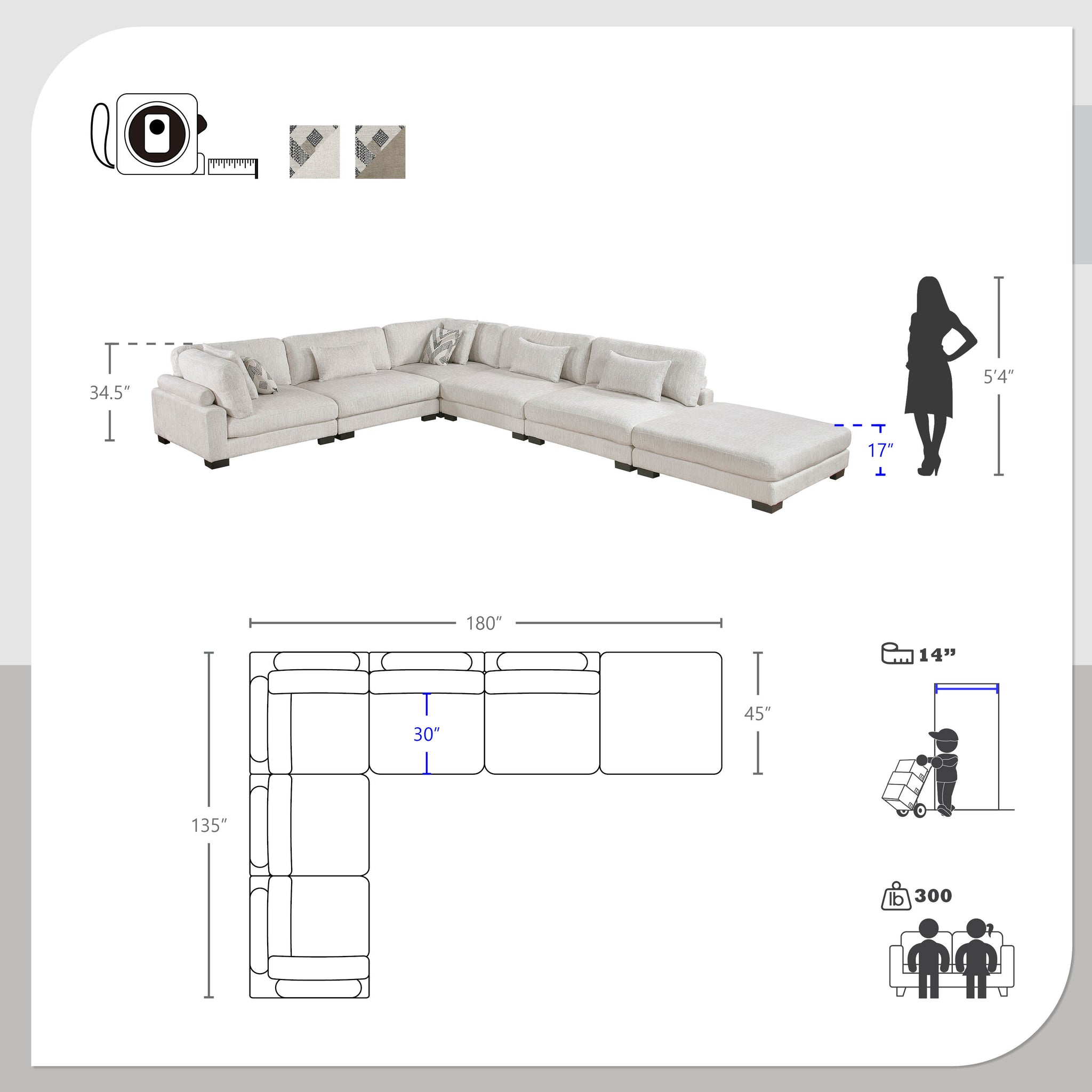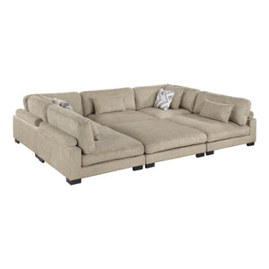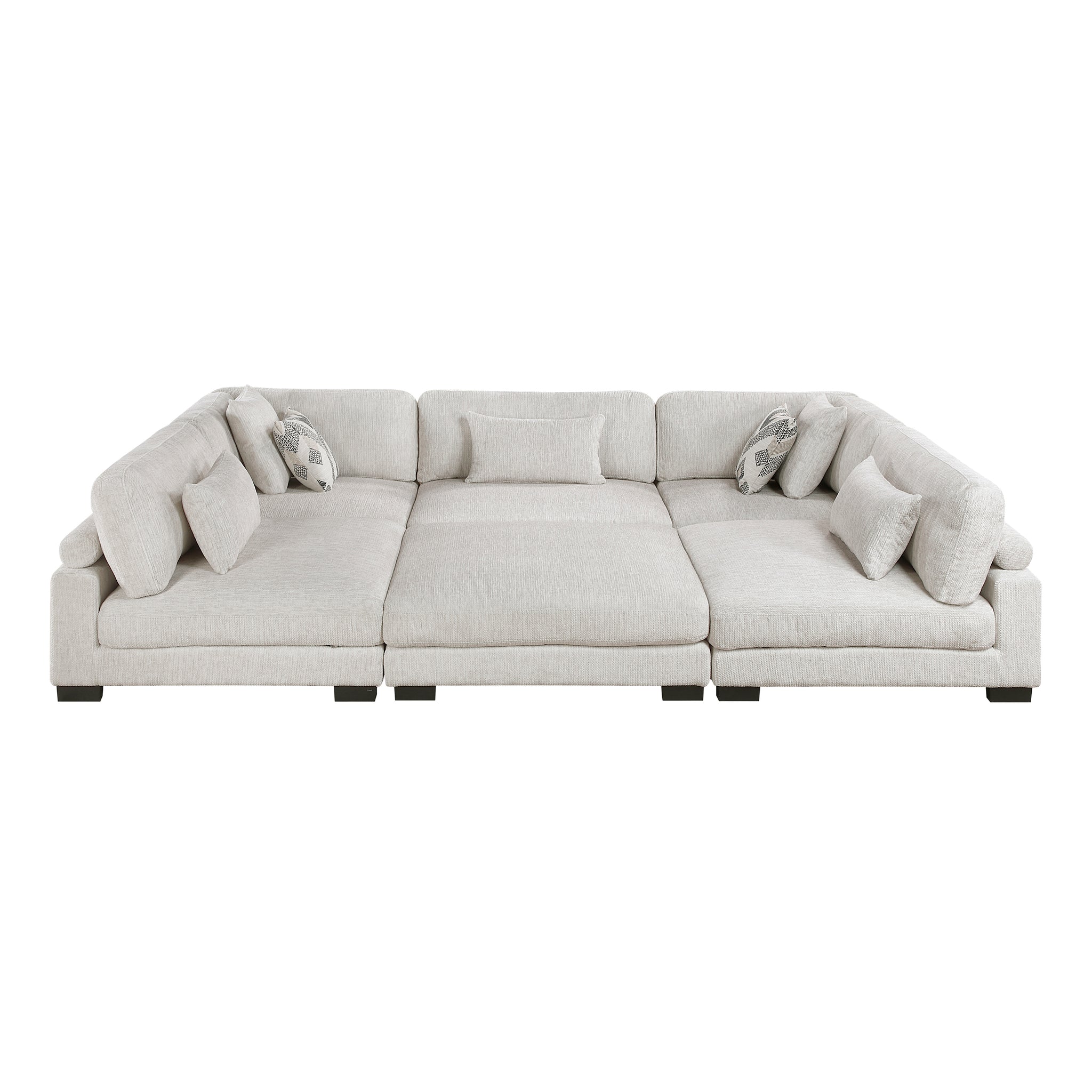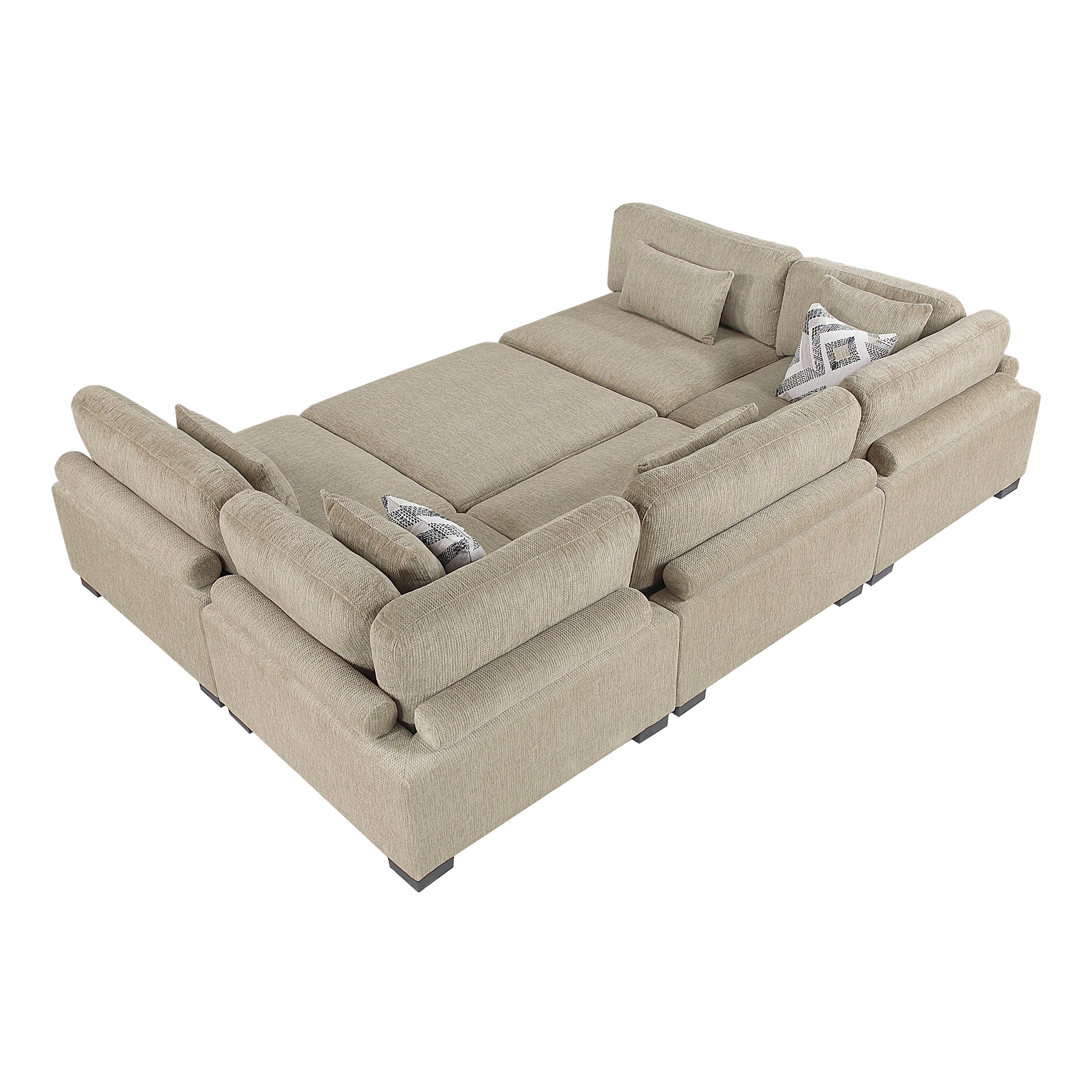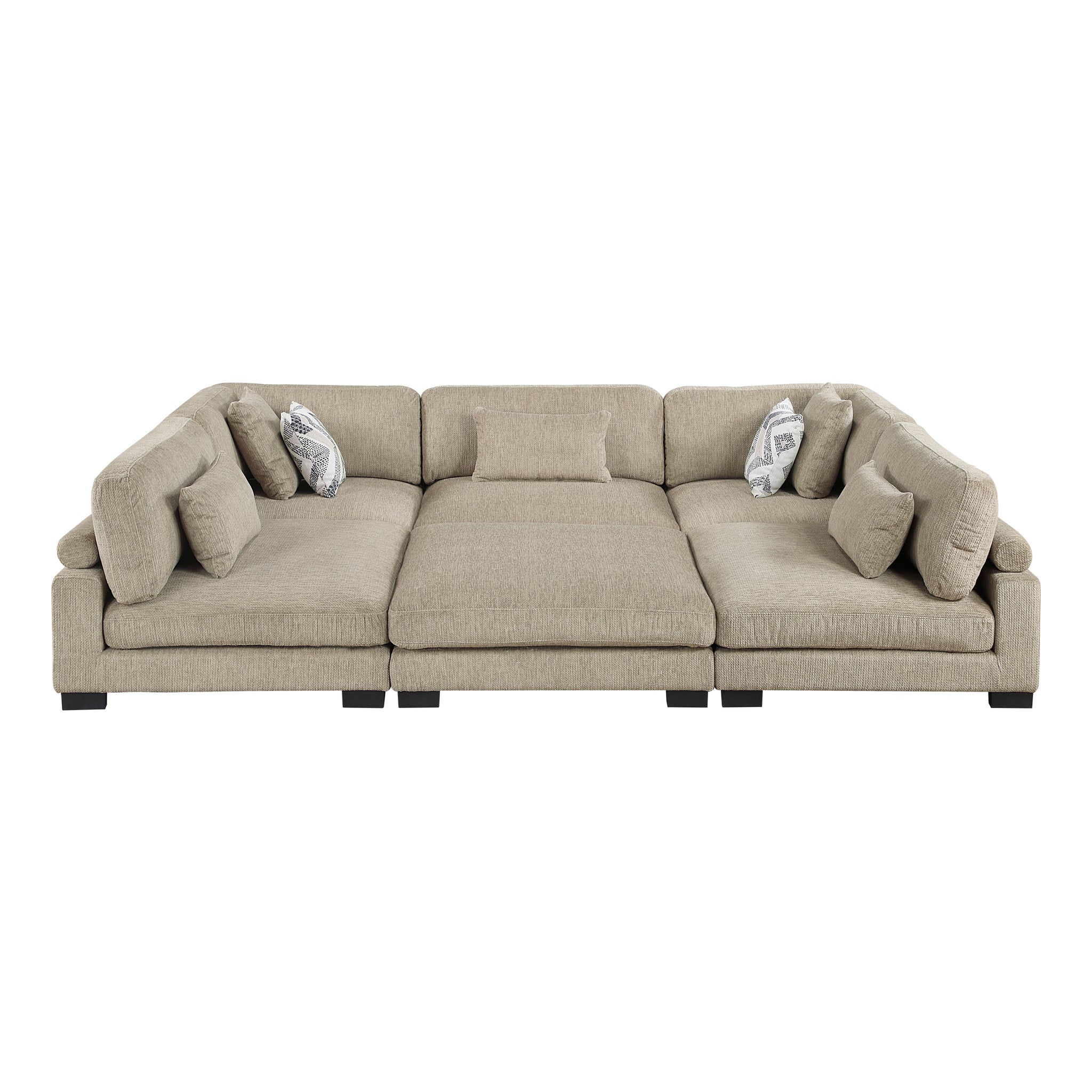 Designed to fit your space, the Abbeville Collection offers a customizable seating arrangement with the option to add or detach pieces. The 6-piece sectional configuration includes two corner units, three armless chairs, and an ottoman. Upholstered in plush textured microfiber, it creates a soft and inviting seating experience. Each corner seat features two toss pillows, an adjustable back and armrest, and reversible cushions, while the armless chair includes a lumbar pillow and reversible cushions, ensuring comfort and versatility for your living space. The collection offered in beige and brown color.