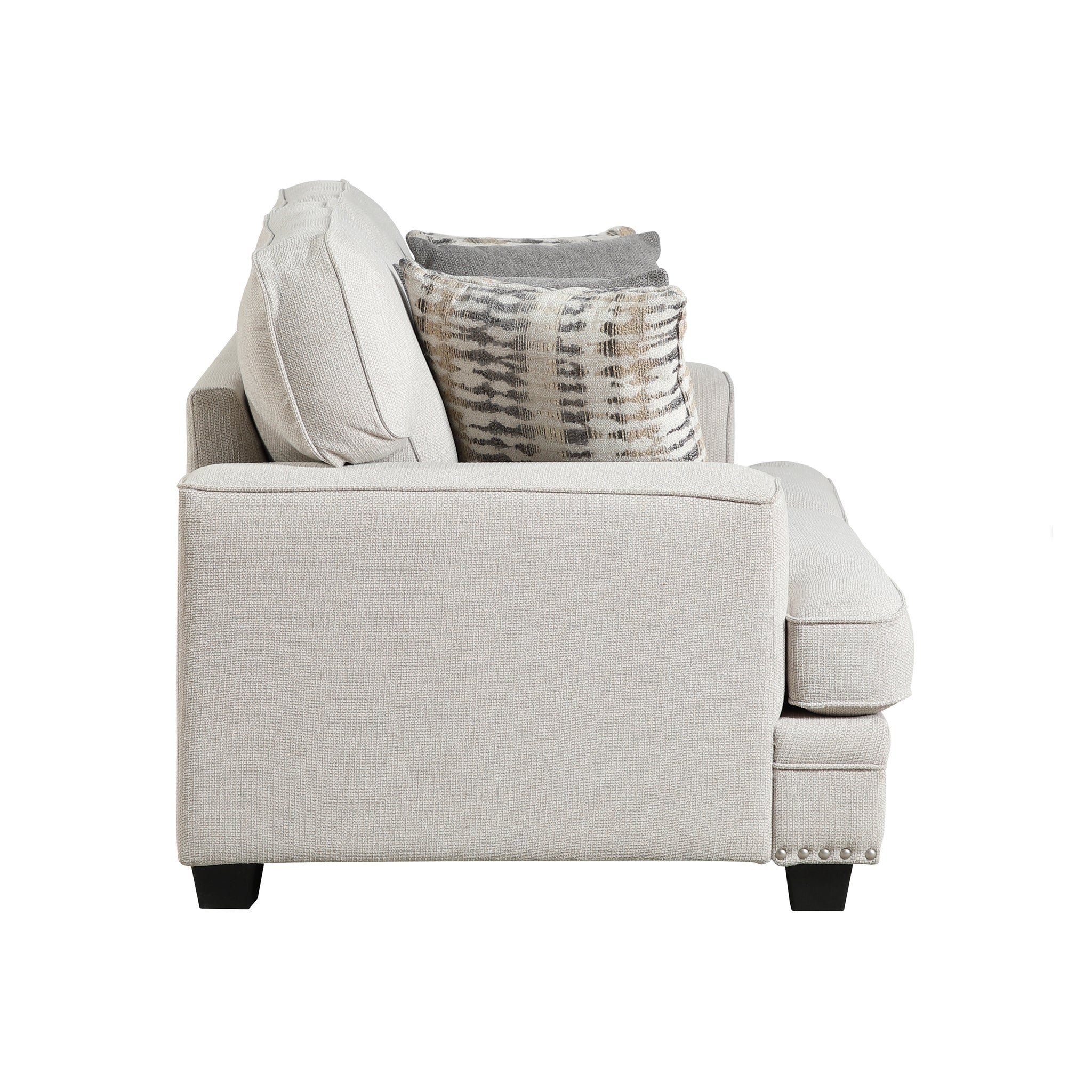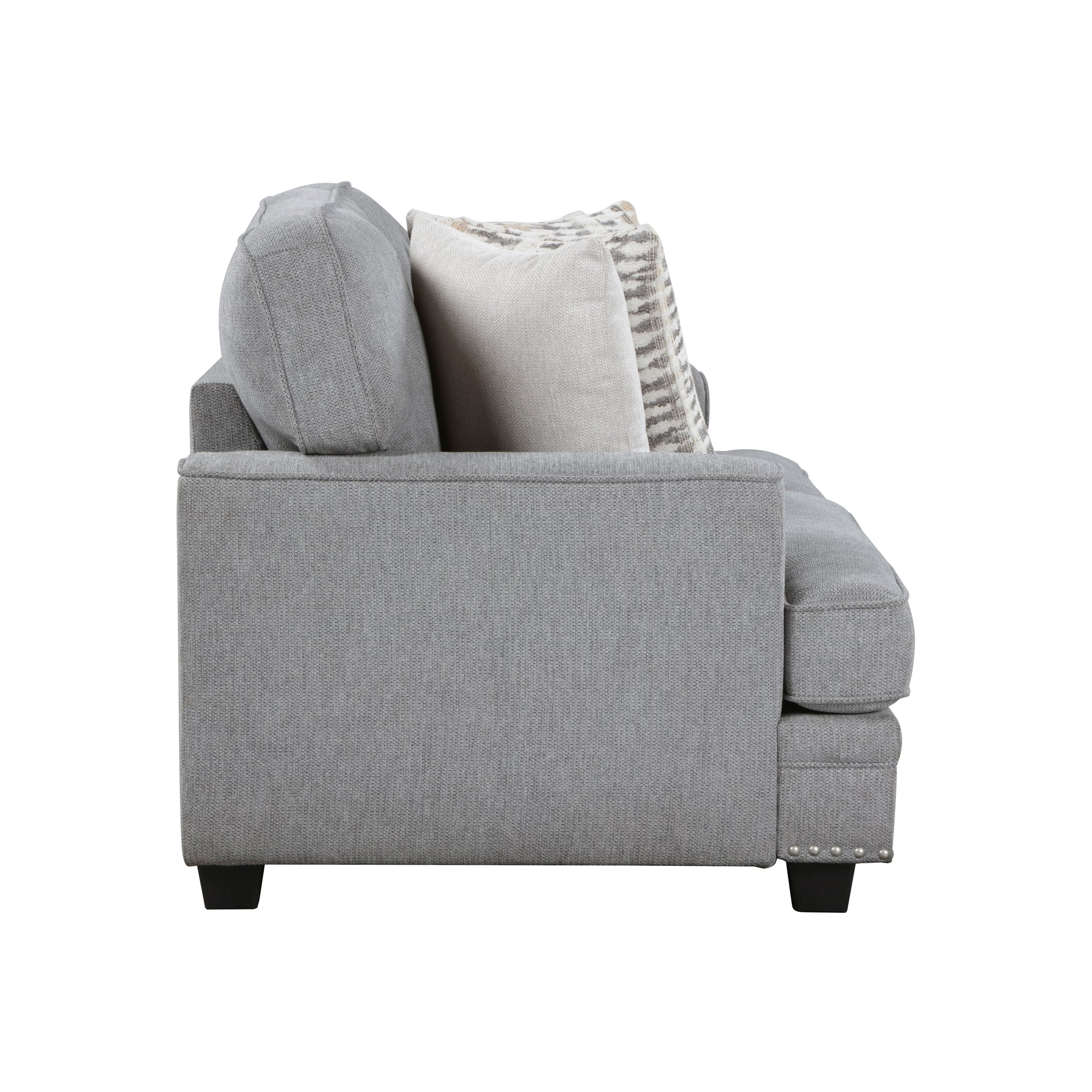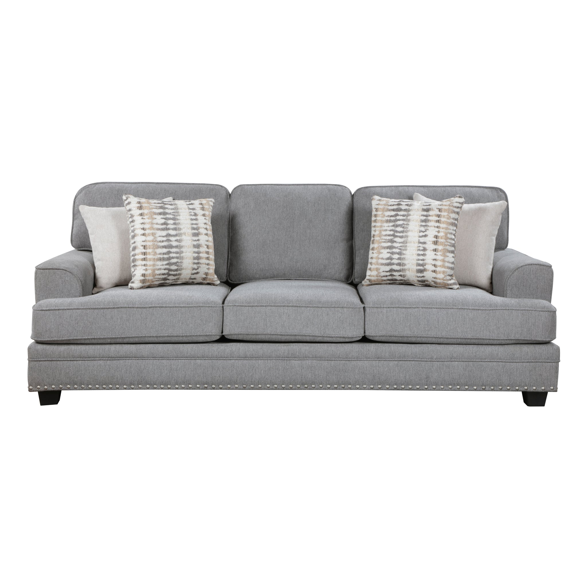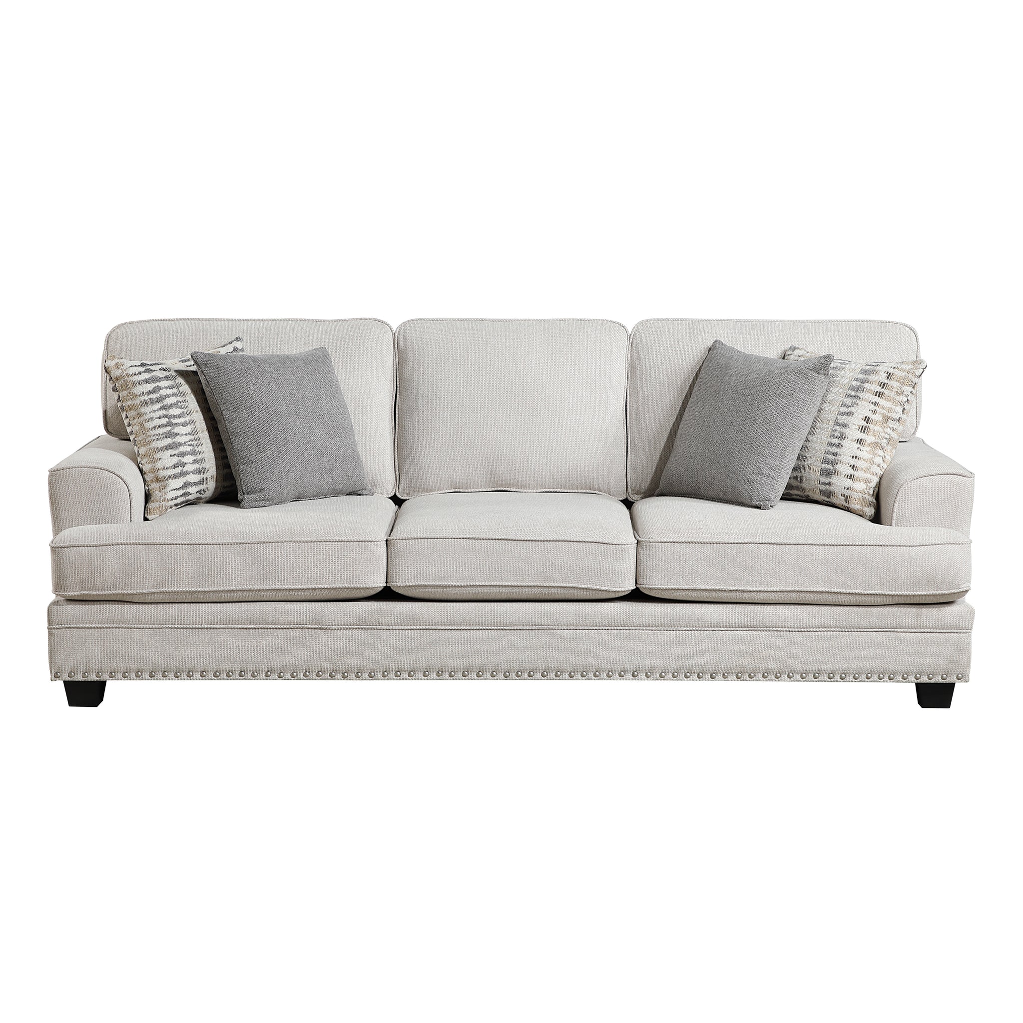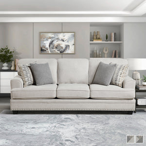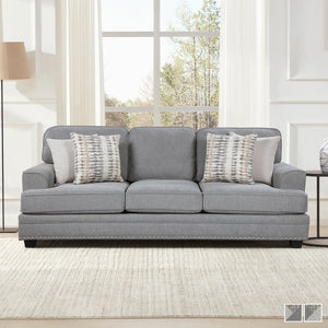 With a transitional design that is a complement to your home’s living room, the Pombal Collection utilizes classic lines, refined texture, and traditional accenting to achieve a universally appealing look. The sofa is covered in solid-hued chenille fabric upholstery. Nail head trim accents the base rail, while profile-defining welting provides a tailored finish. Complementing contrast toss pillows are paired with the sofa. This collection is offered in gray and sand colors.