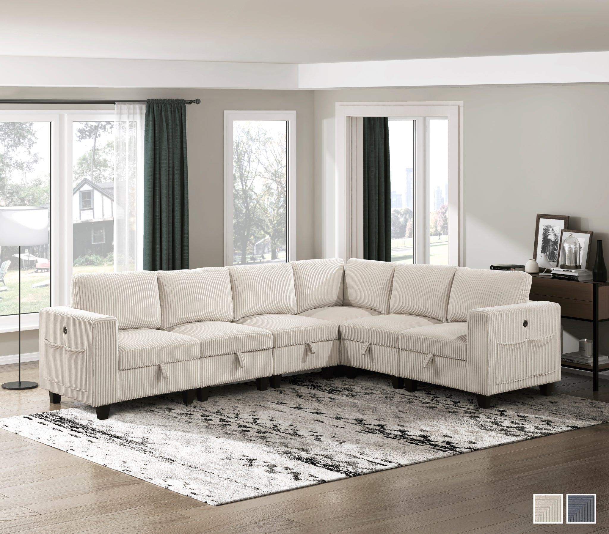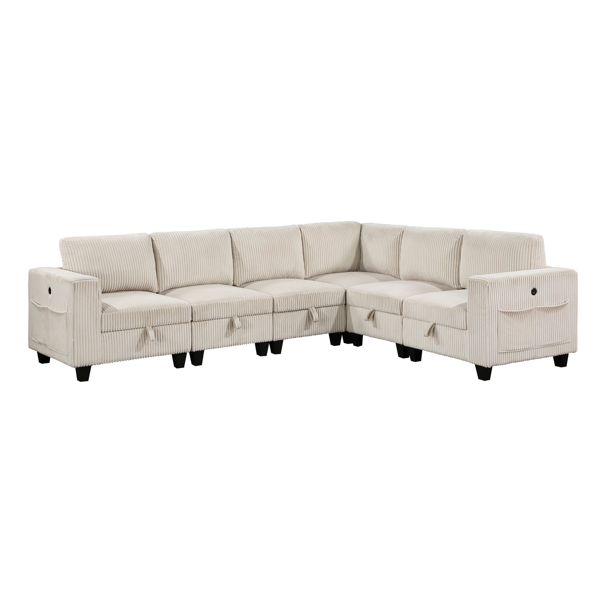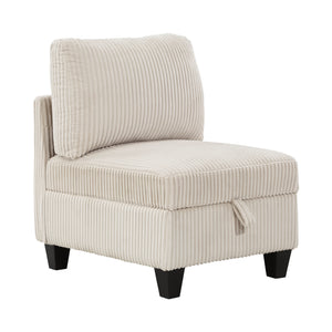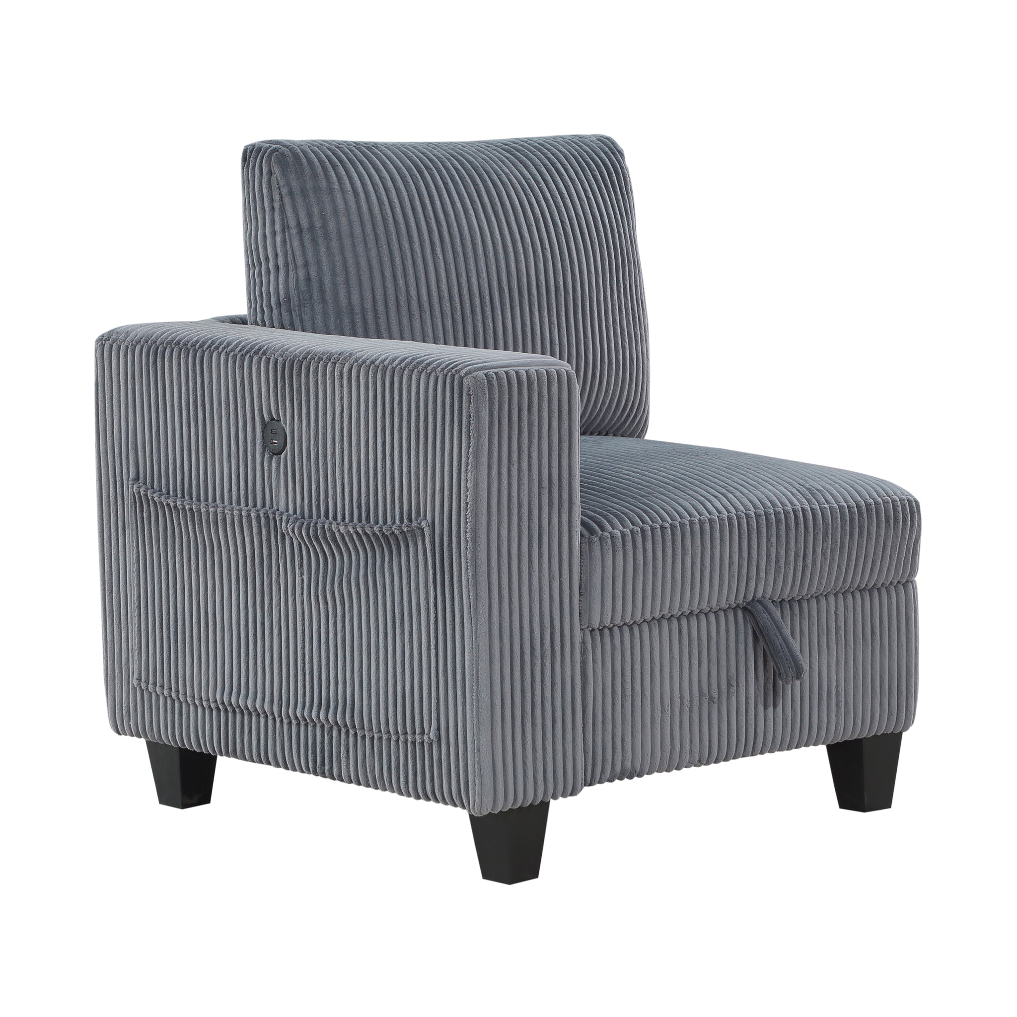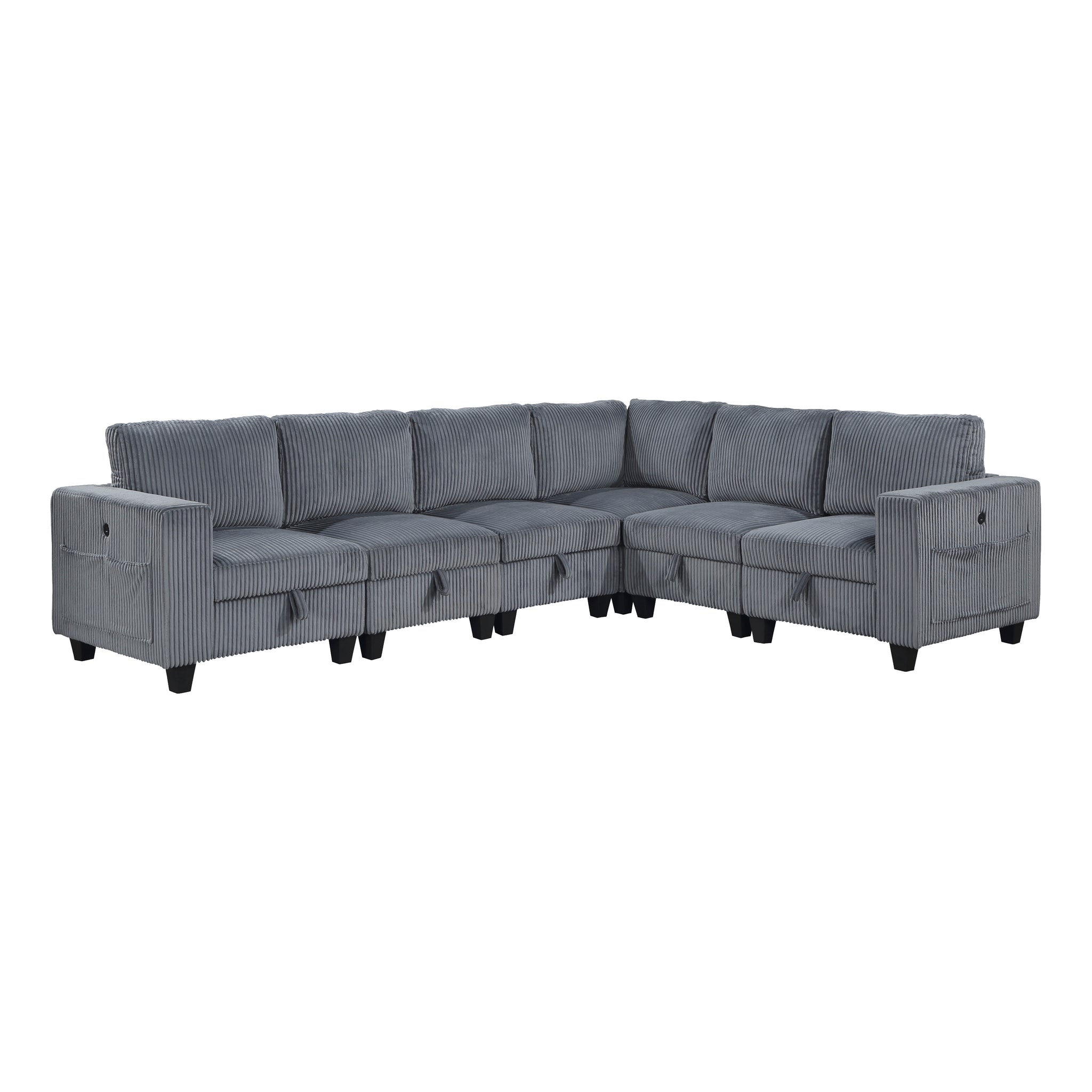 The multifunctional design of the Kenlis Collection creates a seating group that is not only configurable to your available space but serves as a convenient storage spot within your casual living room. Pull-out storage drawers are neatly tucked beneath the armless chairs, and end seats of the sectional, each drawer easily accessible with a pull to the front-mounted loop handle. The corner seating unit of the sectional is anchored by three armless chairs while the two end seat’s arms provide side support and power charging ports. The collection is covered in corduroy fabric for a neutral complement to your home’s décor. The collection offered in beige and dark gray color.