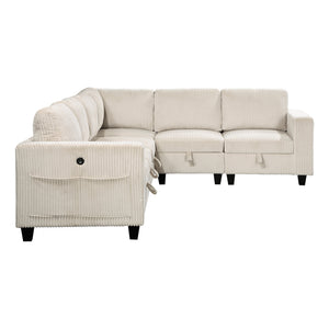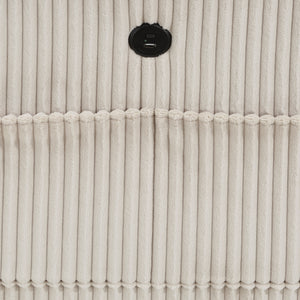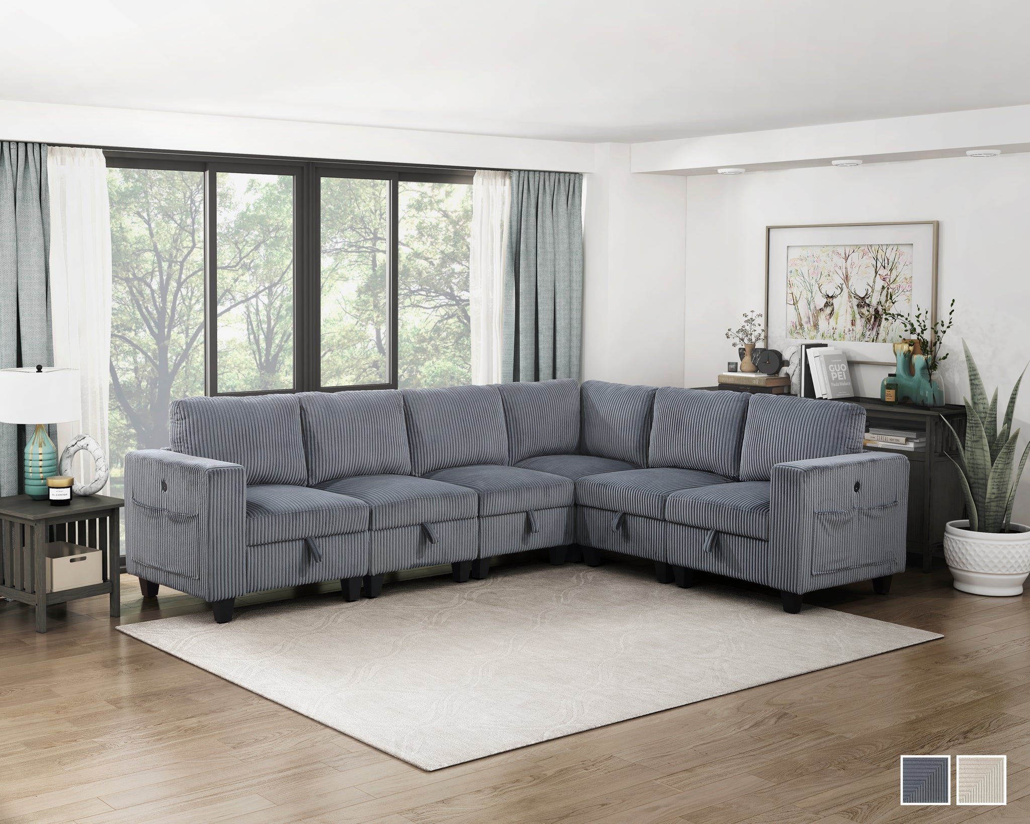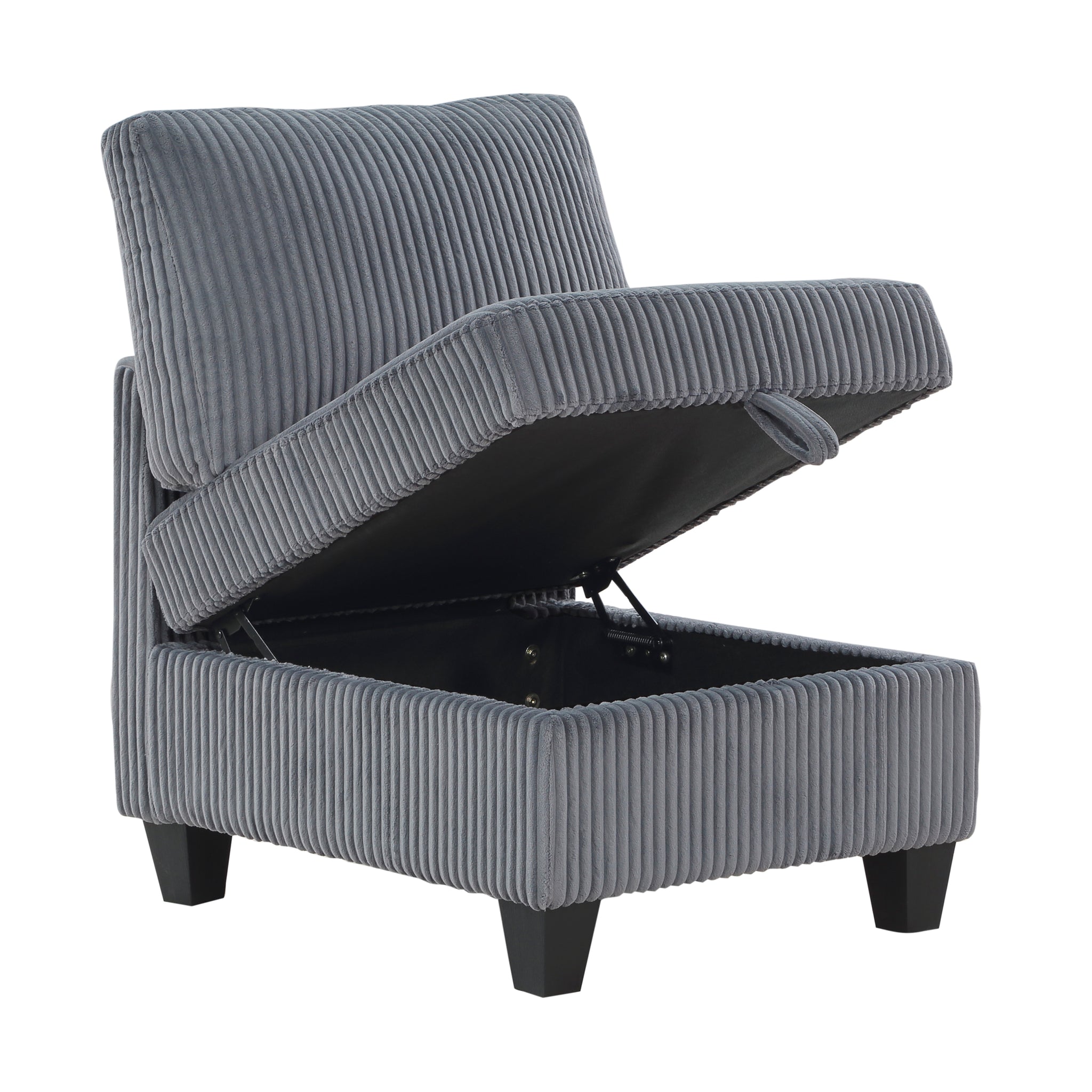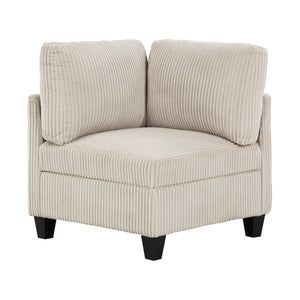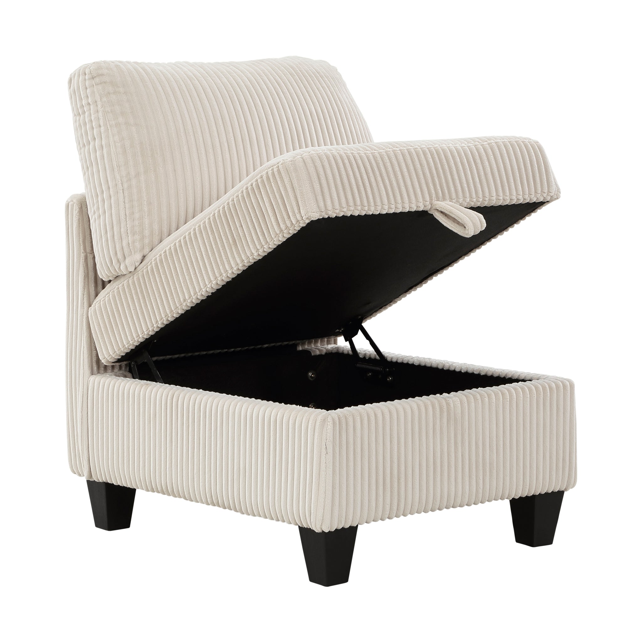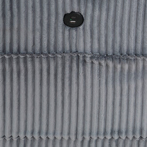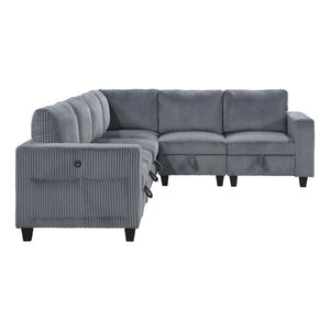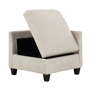 The multifunctional design of the Kenlis Collection creates a seating group that is not only configurable to your available space but serves as a convenient storage spot within your casual living room. Pull-out storage drawers are neatly tucked beneath the armless chairs, and end seats of the sectional, each drawer easily accessible with a pull to the front-mounted loop handle. The corner seating unit of the sectional is anchored by three armless chairs while the two end seat’s arms provide side support and power charging ports. The collection is covered in corduroy fabric for a neutral complement to your home’s décor. The collection offered in beige and dark gray color.