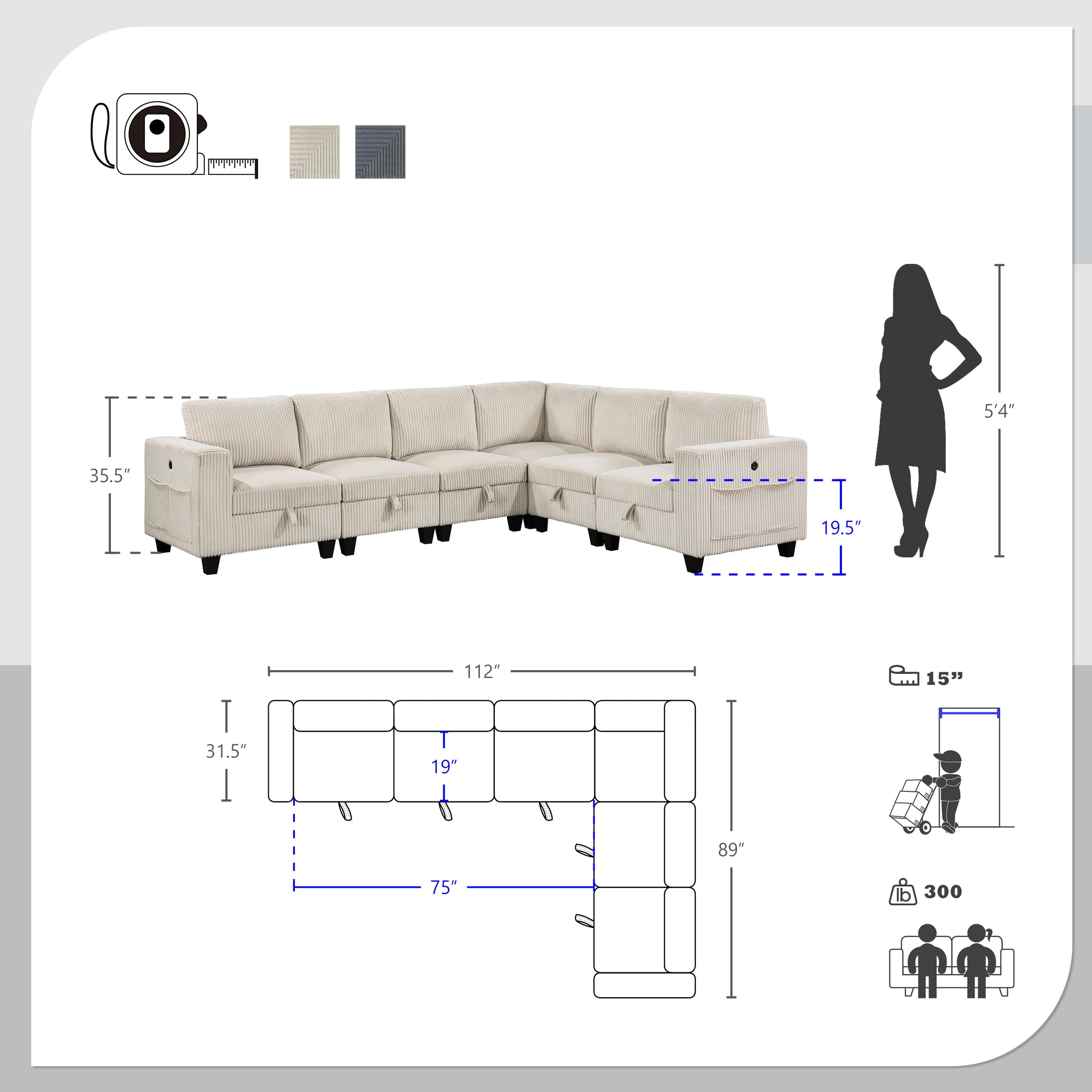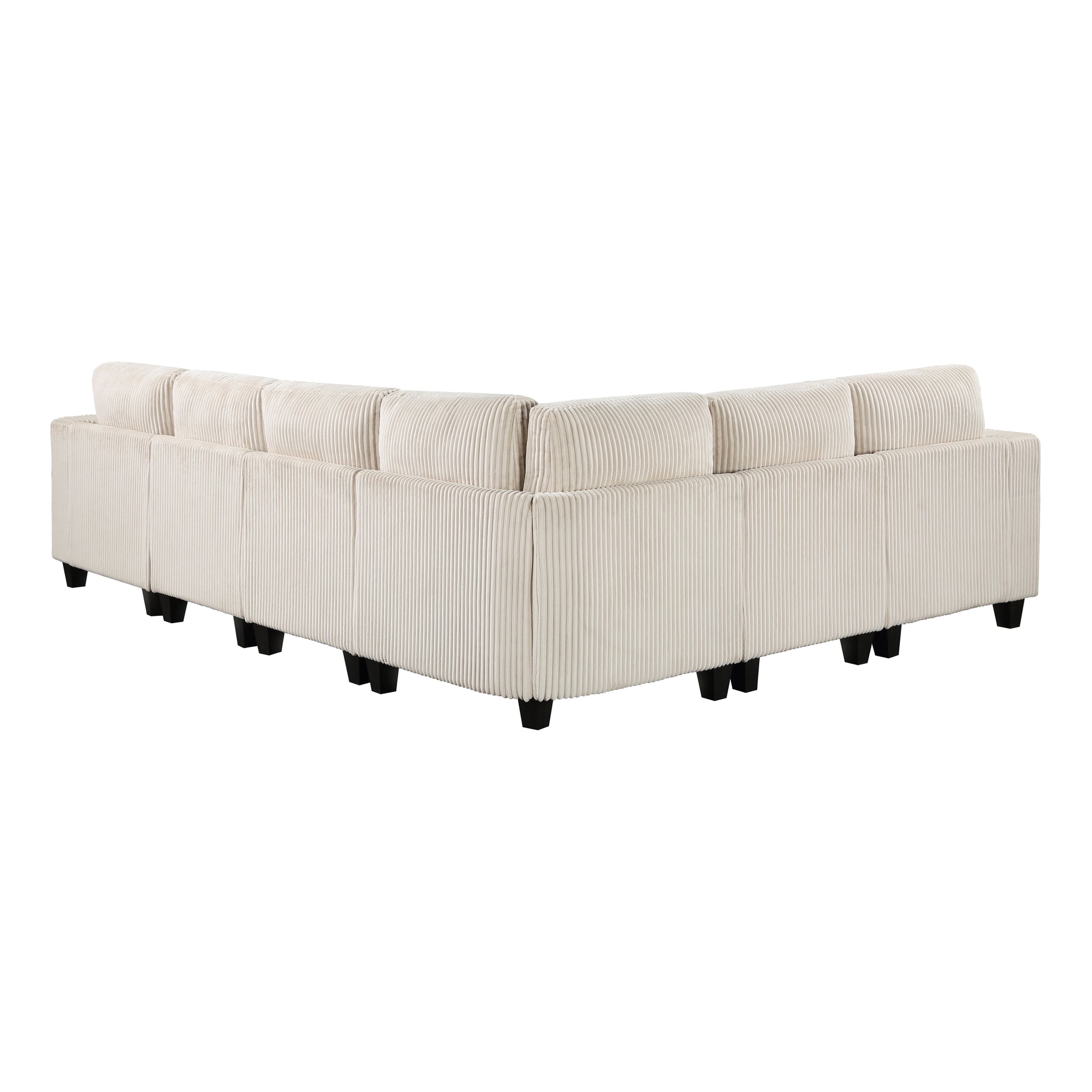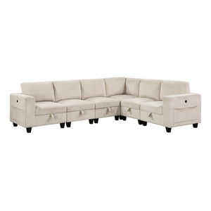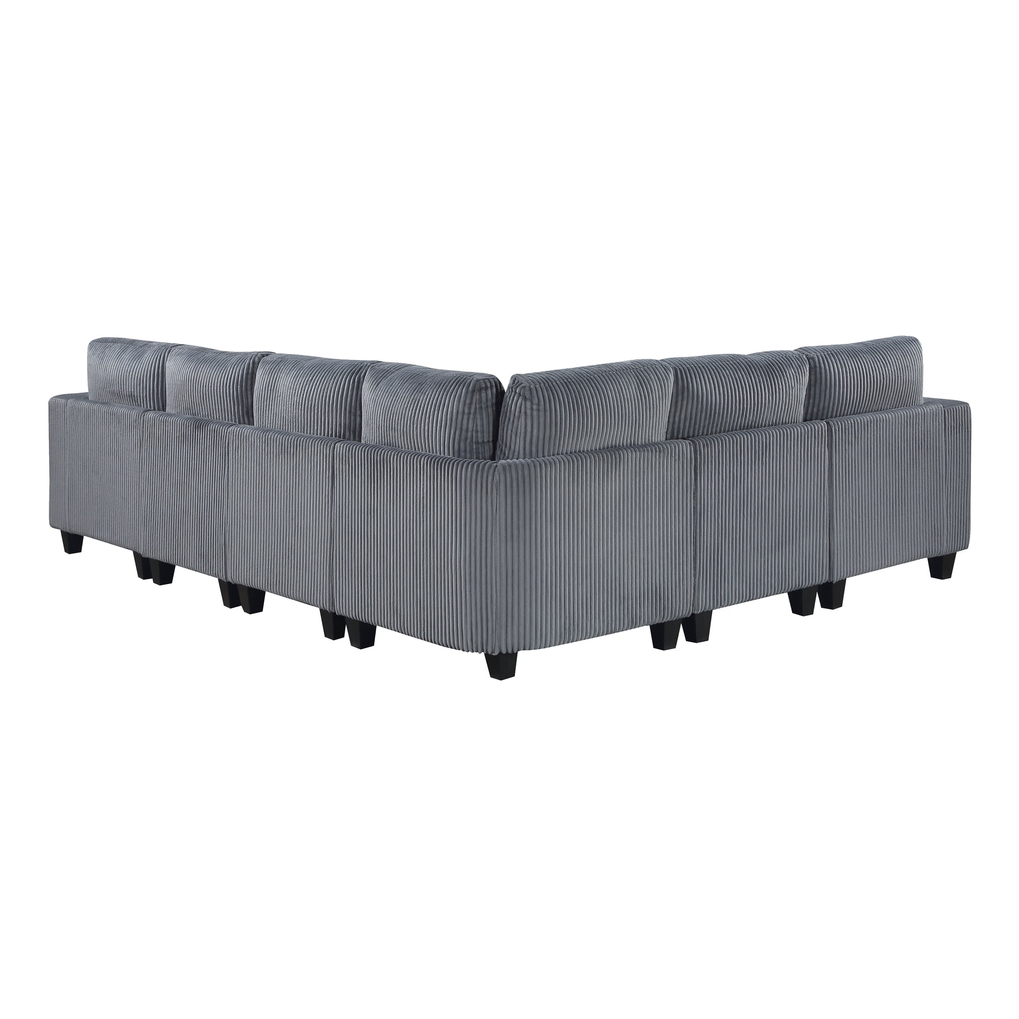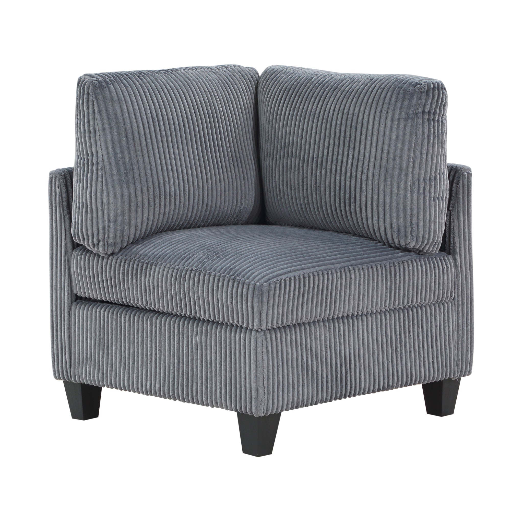 The multifunctional design of the Kenlis Collection creates a seating group that is not only configurable to your available space but serves as a convenient storage spot within your casual living room. Pull-out storage drawers are neatly tucked beneath the armless chairs, and end seats of the sectional, each drawer easily accessible with a pull to the front-mounted loop handle. The corner seating unit of the sectional is anchored by three armless chairs while the two end seat’s arms provide side support and power charging ports. The collection is covered in corduroy fabric for a neutral complement to your home’s décor. The collection offered in beige and dark gray color.